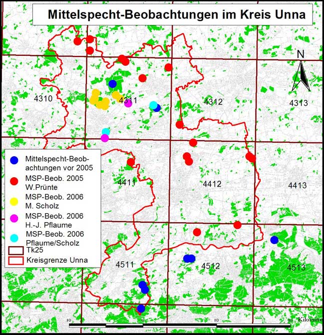 Mittelspechtkartierung im Jahr 2006 Auf dem OAG-Treffen vom 7.02.2006 wurde intensiv über eine Kartierung von Mittelspechten im Kreisgebiet diskutiert. Grundlage war die Beobachtung von W. Prünte, dass im Sommer 2005 Mittelspechte in zahlreichen Wäldern festgestellt werden konnten, in denen die Art in den letzten Jahren nachweislich nicht gebrütet hat. Im Jahr 2006 soll eine Kontrolle dieser Wälder - und ggf. noch weiterer Waldungen - einen Überblick über mögliche Arealveränderungen der Art im Kreisgebiet liefern. Mitarbeiter melden sich bitte bei W. Prünte (w.pruente - at - gmx.de). Kartierungshinweise: Verwendung einer Klangattrappe notwendig (GENEHMIGUNGSPFLICHTIG durch die ULB des Kreises Unna!), 3 - 4 Sequenzen abspielen, 3 Minuten warten, ggf. erneut versuchen. Bei Reaktion sofort abbrechen! Verhalten und Richtungsbewegungen wichtig für Bewertung und Zuordnung von Revieren. Nach ca. 300 m erneutes Abspielen der Klangattrappe. Termine: (E 2) A3 - E4, windstilles, trockenes, nicht zu kaltes (>-5°) Wetter, vormittags günstiger! (aus: Südbeck et al., 2005: Methodenstandards zur Erfassung der Brutvögel Deutschlands, verändert) Die nachstehende Karte gibt einen Überblick über bis Ende 2005 beobachtete Mittelspechte im Kreis Unna (Brutvorkommen und Sommernachweise, die Verwendung der Daten dieser Karte durch Dritte ist nicht gestattet), Nachweise vor 2005 durch die OAG/Brutvogelatlas Kreis Unna, im Jahr 2005 WP: Mittelspecht - Nachweise im Kreis Unna | |||||||||||||||||||||||||||||||||||||||||||||||||||||||||||||||||||||||||||||||||||||||||||